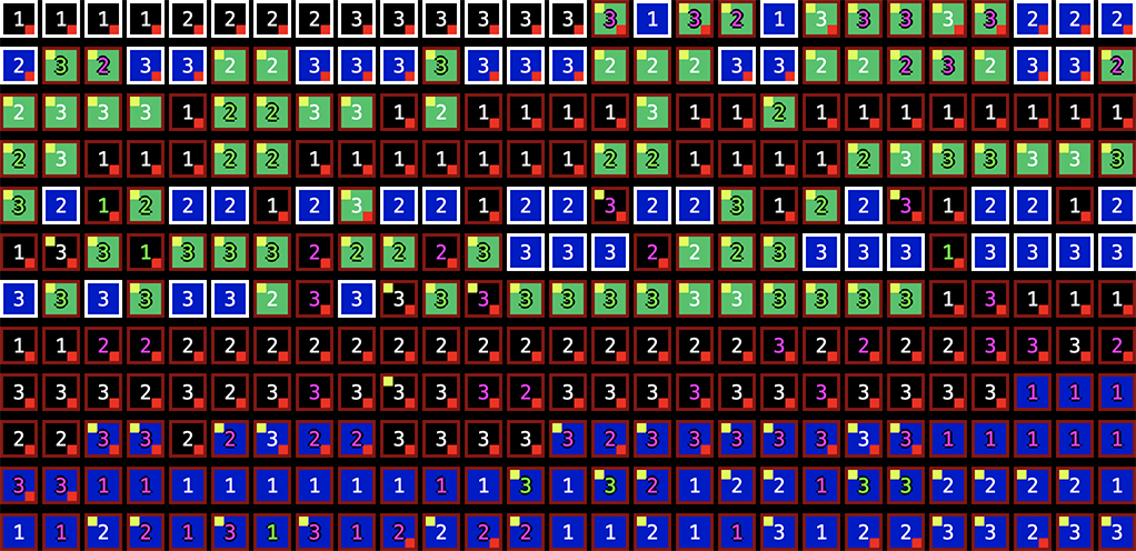 A Group ID is a number assigned to each NFT permutation containing the same colors and color-count. Groups contain 1 to 5 permutations. In total there are 703 Groups. The above is an example of NFTs belonging to Group ID: 331, which contains 3 permutations. Note: Group-IDs are not a documented 'attribute' per each token, rather they are noted in the token's tags.